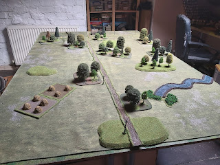 I set the board up as in the Rapid Fire scenario book for games set on the Eastern Front. It is supposed to be played on a 8 foot by 5 foot board, but I was able to get it on my 6 by 4 foot table.